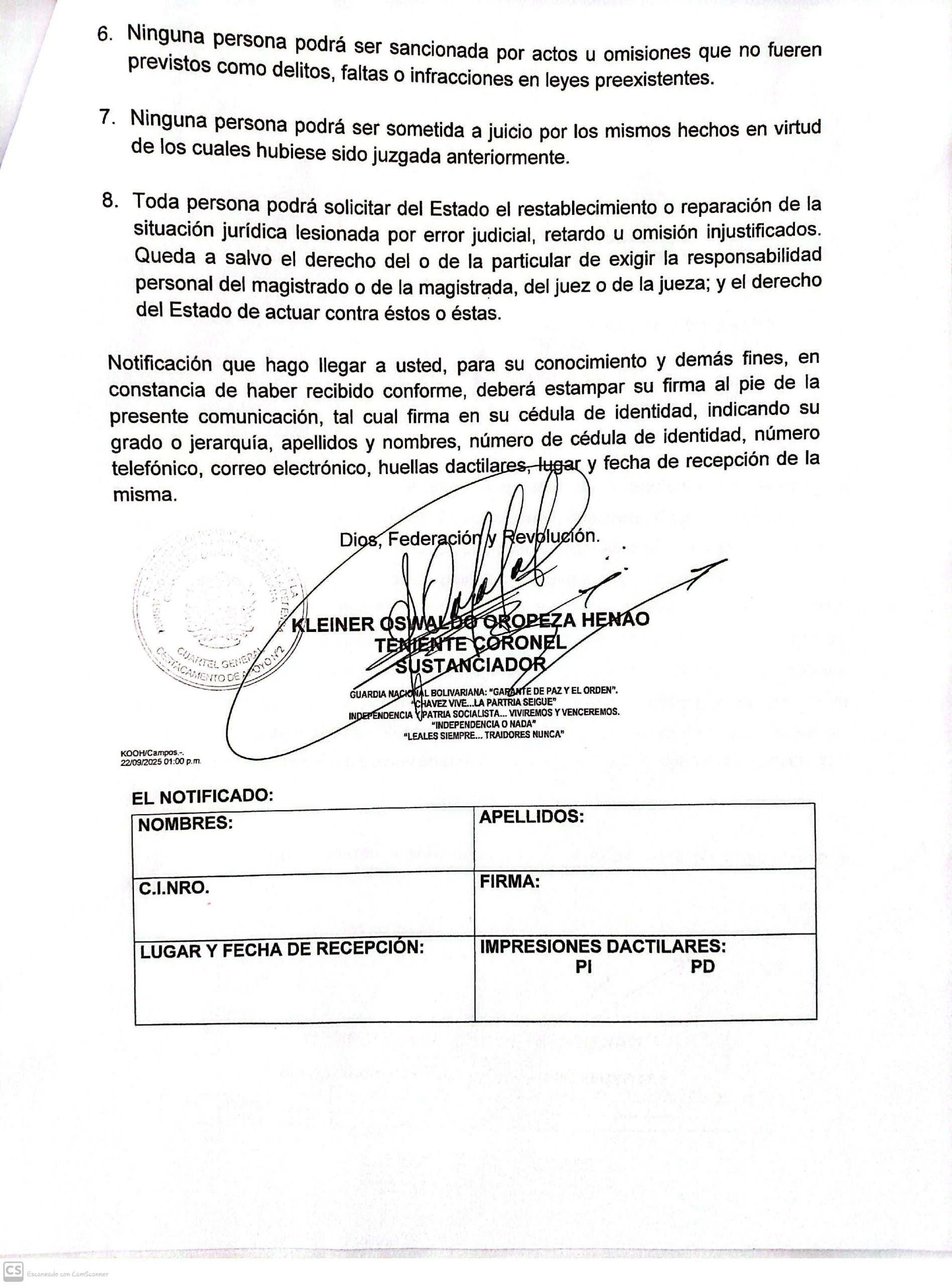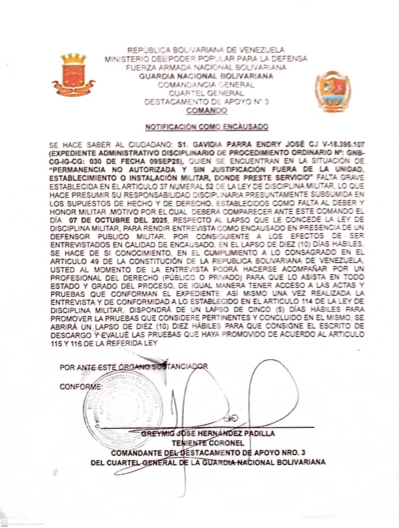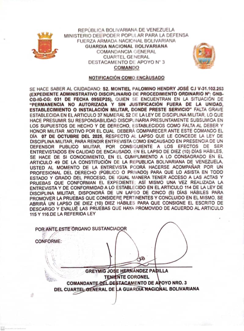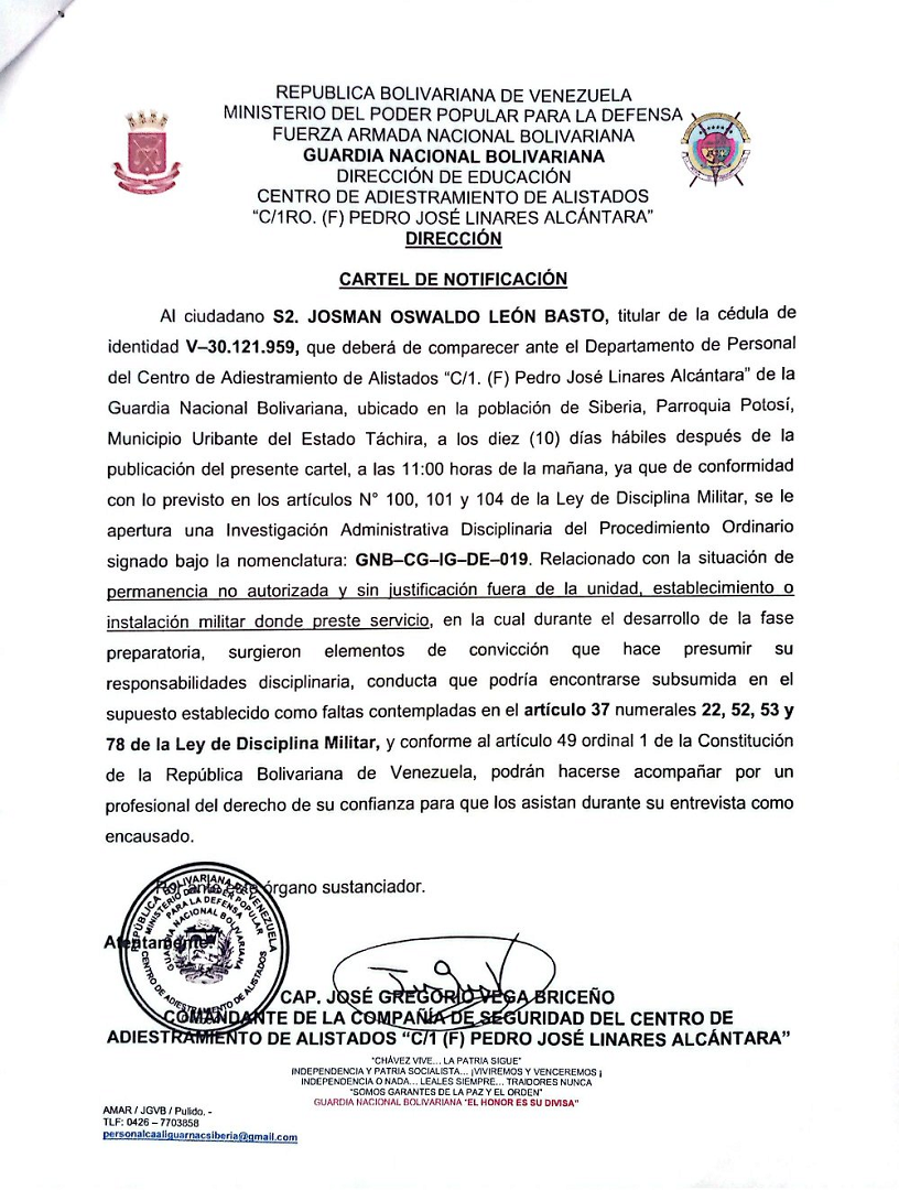 Guardia Nacional Bolivariana Notificaciones SARGENTO SEGUNDO JOSMAN OSWALDO LEÓN BASTO NOTIFICACIÓN sargento primero gavidia parra endry jose sargento segundo montiel palomino hendry jose notificacion sargento primero thenn escalona daniela alexandra NOTIFICACIÓN SARGENTO MAYOR DE SEGUNDA GOMEZ PEREZ JONATHA ALEJANDRO SARGENTO MAYOR DE SEGUNDA JAIMEZ GONZALEZ EDISON CAPITAN RINCON MORILLO RAMON ANTONIO NOTIFICACIÓN NOTIFICACIÓN CAPITAN LUIS JAVIER ROJAS DAVID SARGENTO PRIMERO JOSÉ GREGORIO PATIÑO ALCALÁ NOTIFICACIÓN NOTIFICACIÓN SARGENTO MAYOR DE TERCERA TRIBIÑO SUAREZ JESUS ANGEL PRIMER TENIENTE OSCAR ALFREDO GIL SOLIS PRIMER TENIENTE JHOSEF EMANUEL GUTIÈRREZ MÈNDOZA PRIMER TENIENTE RUBEN ALONSO GÒMEZ PIÑEROS TENIENTE HÈCTOR LUIS MUÑOZ MENDOZA NOTIFICACIÓN NOTIFICACIÓN SARGENTO SEGUNDO ENDERSON JOSÉ VARGAS LUCENA TENIENTE RICHARD JOSÉ TIRADO PÉREZ TENIENTE JHEILY VANESSA CONTRERAS TROMPETERO NOTIFICACIÓN NOTIFICACIÓN PRIMER TENIENTE HEBER JUNIOR GIANITTI ESCALONA SARGENTO PRIMERO NEIBIS CHAVEZ CHOURIO SARGENTO SEGUNDO ANDRÉS ELOY BENTA GUTIÉRREZ PRIMER TENIENTE HEBER JUNIOR GIANITTI ESCALONA NOTIFICACIÓN NOTIFICACIÓN SARGENTO SEGUNDO JAMPIER ADONIS FLORES TORRES SARGENTO SEGUNDO LUIS ANTONIO HOYO BERBESI NOTIFICACIÓN CAPITÁN NELSI ROSSI LAMBOS SARGENTO MAYOR DE TERCERA KENDRIS JOSÉ VILLALOBOS FARIAS SARGENTO SEGUNDO DAVID SALOMÓN LÓPEZ VILLEGAS SARGENTO SEGUNDO RONAL JOSÉ LEAL GAMEZ SARGENTO SEGUNDO ABRAHAN JOSE SALAZAR FARIAS SARGENTO PRIMERO ANTHONY JOSÉ ALCALA DIAZ SARGENTO PRIMERO FELIANYER JOSÉ GARCIA MORILLO PRIMER TENIENTE MANUEL ALEJANDRO ESCALONA SILVA SARGENTO MAYOR DE PRIMERA NELSON ANTONIO HERNANDEZ CASADIEGO SARGENTO SEGUNDO KELVIN DANIEL HERRERA MONTOYA SARGENTO SEGUNDO JESÚS DAVID GARCÍA BARROSO SARGENTO SEGUNDO JEYKER MIGUEL MOLLEJAS GÓMEZ SARGENTO PRIMERO YEMBER SILVA ALBARRACIN SARGENTO SEGUNDO JULIANY PAOLA PALMAR PALMAR NOTIFICACIÓN NOTIFICACIÓN SARGENTO SEGUNDO CESAR ANTONIO MOTABAN CHANCHAMIRE SARGENTO SEGUNDO ÁNGEL ELOY AZOCAR MEZA SARGENTO PRIMERO ADAN ADOLFO LASCANO ÁLVARES SARGENTO SEGUNDO JOSÉ RAMÓN PÉREZ NATERA NOTIFICACIÓN NOTIFICACIÓN SARGENTO SEGUNDO JOSÉ RAMÓN PÉREZ NATERA TENIENTE JOSÉ MANUEL OSORIO RAMONES CAPITÁN JESÚS EDGARDO ROJAS GUTIERREZ NOTIFICACIÓN NOTIFICACIÓN CAPITÁN ROMER JESÚS RAMÍREZ CAMPOS NOTIFICACIÓN PRIMER TENIENTE DOMINGUEZ GRILLET JOSE MIGUEL SARGENTO PRIMERO MEDINA GONZALEZ ALEXANDER ANTONIO CORONEL CARLOS ALDRIN PERALTA PÉREZ SARGENTO MAYOR DE TERCERA WILLIAN JOSUE MANTILLA ARIAS SARGENTO PRIMERO HUMBERTO JOSÉ ROMERO PARRA TENIENTE HÉCTOR LUIS MUÑOZ MENDOZA PRIMER TENIENTE EDGAR JOSÉ GONZÁLEZ GONZÁLEZ PRIMER TENIENTE RUBEN ALONSO GOMEZ PIÑERO SARGENTO SEGUNDO ROSSTHY ANTONIO PÉREZ LAMEDA PRIMER TENIENTE JOSÉ RICARDO FLORES BOJACA PRIMER TENIENTE LORWING ALBERTO CASTELLANOS QUIVA Capitan Rodríguez Piña Will Alinson Primer Teniente María Nazareth Cuamo Ospino Teniente Delgado Piña Alejandra del Valle