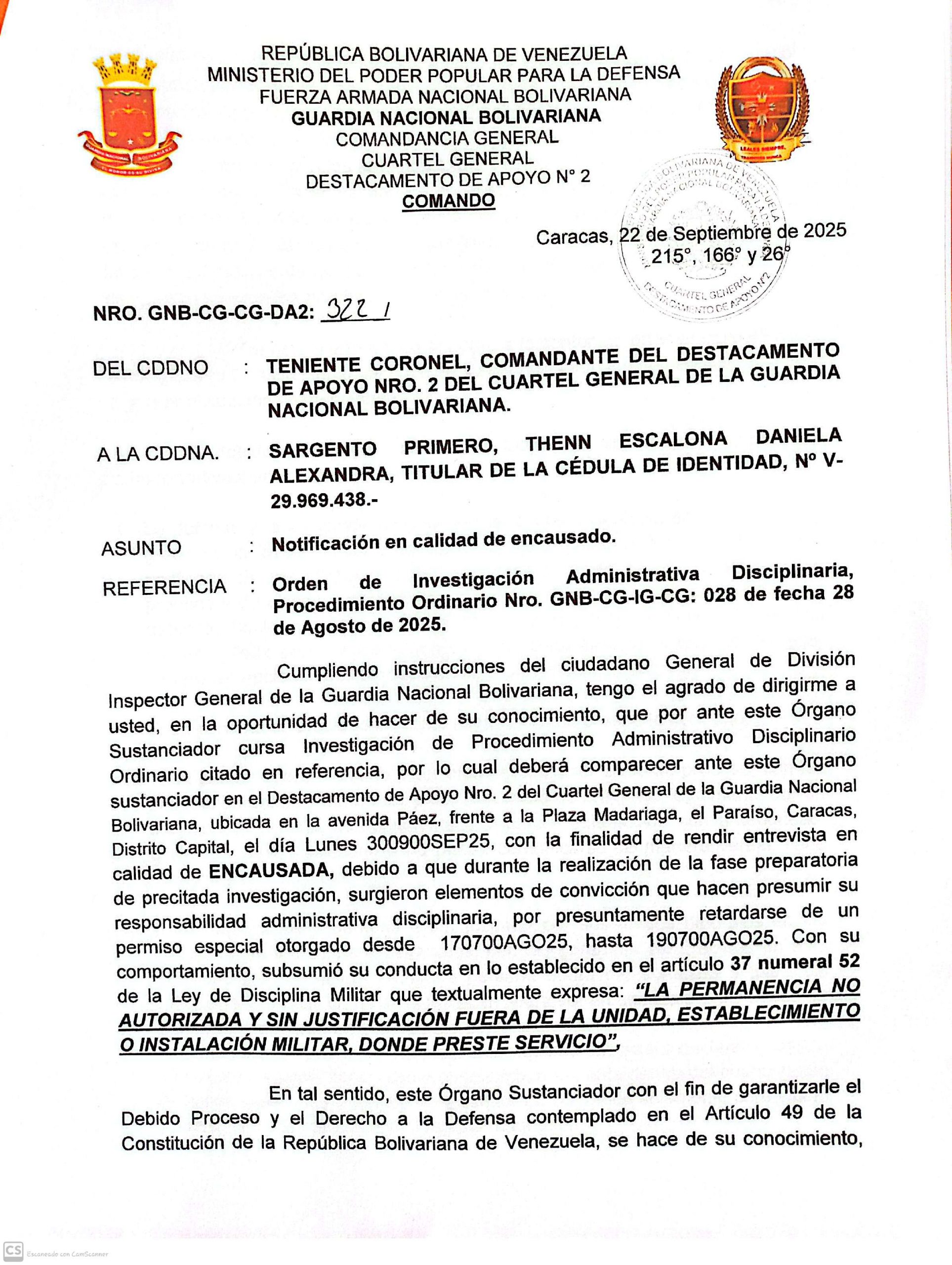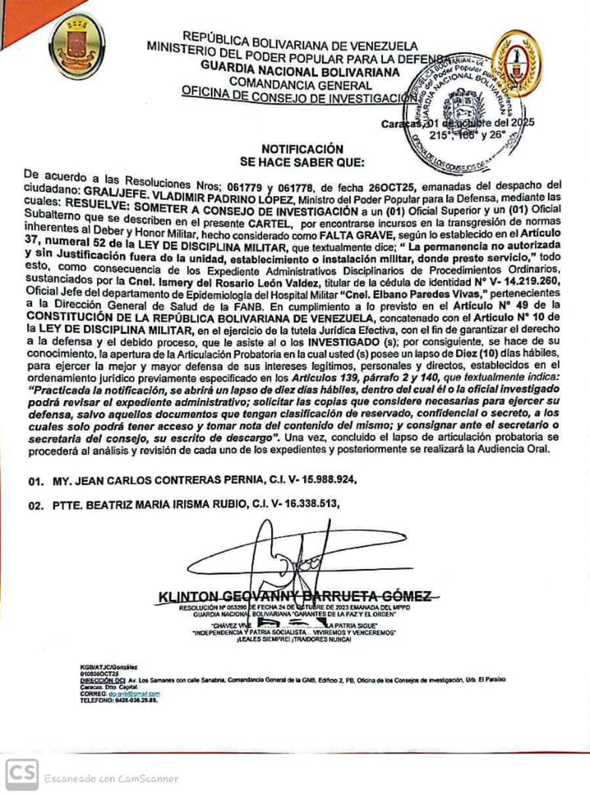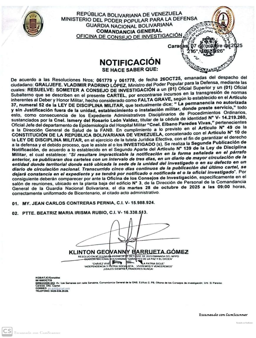 Guardia Nacional Bolivariana Notificaciones SARGENTO SEGUNDO JOSMAN OSWALDO LEÓN BASTO NOTIFICACIÓN sargento primero gavidia parra endry jose sargento segundo montiel palomino hendry jose notificacion sargento primero thenn escalona daniela alexandra NOTIFICACIÓN SARGENTO MAYOR DE SEGUNDA GOMEZ PEREZ JONATHA ALEJANDRO SARGENTO MAYOR DE SEGUNDA JAIMEZ GONZALEZ EDISON CAPITAN RINCON MORILLO RAMON ANTONIO NOTIFICACIÓN NOTIFICACIÓN CAPITAN LUIS JAVIER ROJAS DAVID SARGENTO PRIMERO JOSÉ GREGORIO PATIÑO ALCALÁ NOTIFICACIÓN NOTIFICACIÓN SARGENTO MAYOR DE TERCERA TRIBIÑO SUAREZ JESUS ANGEL PRIMER TENIENTE OSCAR ALFREDO GIL SOLIS PRIMER TENIENTE JHOSEF EMANUEL GUTIÈRREZ MÈNDOZA PRIMER TENIENTE RUBEN ALONSO GÒMEZ PIÑEROS TENIENTE HÈCTOR LUIS MUÑOZ MENDOZA NOTIFICACIÓN NOTIFICACIÓN SARGENTO SEGUNDO ENDERSON JOSÉ VARGAS LUCENA TENIENTE RICHARD JOSÉ TIRADO PÉREZ TENIENTE JHEILY VANESSA CONTRERAS TROMPETERO NOTIFICACIÓN NOTIFICACIÓN PRIMER TENIENTE HEBER JUNIOR GIANITTI ESCALONA SARGENTO PRIMERO NEIBIS CHAVEZ CHOURIO SARGENTO SEGUNDO ANDRÉS ELOY BENTA GUTIÉRREZ PRIMER TENIENTE HEBER JUNIOR GIANITTI ESCALONA NOTIFICACIÓN NOTIFICACIÓN SARGENTO SEGUNDO JAMPIER ADONIS FLORES TORRES SARGENTO SEGUNDO LUIS ANTONIO HOYO BERBESI NOTIFICACIÓN CAPITÁN NELSI ROSSI LAMBOS SARGENTO MAYOR DE TERCERA KENDRIS JOSÉ VILLALOBOS FARIAS SARGENTO SEGUNDO DAVID SALOMÓN LÓPEZ VILLEGAS SARGENTO SEGUNDO RONAL JOSÉ LEAL GAMEZ SARGENTO SEGUNDO ABRAHAN JOSE SALAZAR FARIAS SARGENTO PRIMERO ANTHONY JOSÉ ALCALA DIAZ SARGENTO PRIMERO FELIANYER JOSÉ GARCIA MORILLO PRIMER TENIENTE MANUEL ALEJANDRO ESCALONA SILVA SARGENTO MAYOR DE PRIMERA NELSON ANTONIO HERNANDEZ CASADIEGO SARGENTO SEGUNDO KELVIN DANIEL HERRERA MONTOYA SARGENTO SEGUNDO JESÚS DAVID GARCÍA BARROSO SARGENTO SEGUNDO JEYKER MIGUEL MOLLEJAS GÓMEZ SARGENTO PRIMERO YEMBER SILVA ALBARRACIN SARGENTO SEGUNDO JULIANY PAOLA PALMAR PALMAR NOTIFICACIÓN NOTIFICACIÓN SARGENTO SEGUNDO CESAR ANTONIO MOTABAN CHANCHAMIRE SARGENTO SEGUNDO ÁNGEL ELOY AZOCAR MEZA SARGENTO PRIMERO ADAN ADOLFO LASCANO ÁLVARES SARGENTO SEGUNDO JOSÉ RAMÓN PÉREZ NATERA NOTIFICACIÓN NOTIFICACIÓN SARGENTO SEGUNDO JOSÉ RAMÓN PÉREZ NATERA TENIENTE JOSÉ MANUEL OSORIO RAMONES CAPITÁN JESÚS EDGARDO ROJAS GUTIERREZ NOTIFICACIÓN NOTIFICACIÓN CAPITÁN ROMER JESÚS RAMÍREZ CAMPOS NOTIFICACIÓN PRIMER TENIENTE DOMINGUEZ GRILLET JOSE MIGUEL SARGENTO PRIMERO MEDINA GONZALEZ ALEXANDER ANTONIO CORONEL CARLOS ALDRIN PERALTA PÉREZ SARGENTO MAYOR DE TERCERA WILLIAN JOSUE MANTILLA ARIAS SARGENTO PRIMERO HUMBERTO JOSÉ ROMERO PARRA TENIENTE HÉCTOR LUIS MUÑOZ MENDOZA PRIMER TENIENTE EDGAR JOSÉ GONZÁLEZ GONZÁLEZ PRIMER TENIENTE RUBEN ALONSO GOMEZ PIÑERO SARGENTO SEGUNDO ROSSTHY ANTONIO PÉREZ LAMEDA PRIMER TENIENTE JOSÉ RICARDO FLORES BOJACA PRIMER TENIENTE LORWING ALBERTO CASTELLANOS QUIVA Capitan Rodríguez Piña Will Alinson Primer Teniente María Nazareth Cuamo Ospino Teniente Delgado Piña Alejandra del Valle